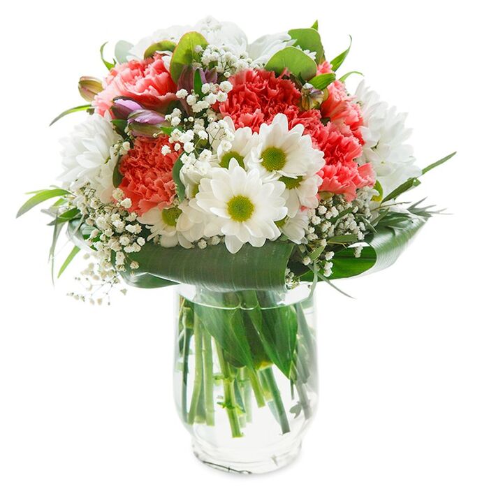 There is a joyful exuberance to this bouquet, styled with flair inside a sleek white gift bag, perfectly echoing the creative pulse of Lower Clapton. Generous ruffles of coral and cherry-red carnations give the arrangement a plush, vibrant base, their vivid hues recalling the colourful artistry of local street murals. Nestled among the bold carnations are crisp white daisies with sunlit yellow-green eyes, each blossom seeming to radiate the friendly warmth found along Chatsworth Road. Wispy clusters of baby's breath drift among the main blooms, softening the scene with a dreamy lightness, while hints of closed, lavender-tinged buds peek out, hinting at surprises waiting to unfold-much like the area's hidden cafes and artisan studios. Encircling everything is a ring of glossy, deep green leaves, shaped to cradle the flowers in natural elegance and hold the bouquet's rounded form. The sturdy white handles add convenience, underscoring the ease of sending or gifting this bouquet anywhere in Lower Clapton. Against a stark white backdrop, the bouquet's colours and textures are shown at their finest, making it ideal for brightening birthdays, celebrating achievements, or simply sending a touch of everyday joy across the local community. Crafted with care by passionate florists, this arrangement feels like a heartfelt gesture from the very heart of Lower Clapton. This radiant Lower Clapton bouquet is a celebration of freshness and the ever-changing beauty of Hackney's East End. The composition centres on joyful white daisies, each with bright green cores, surrounded by radiant coral-pink carnations whose ruffled petals add playful depth and movement. Whisper-light gypsophila clusters interlace throughout the bouquet, giving the arrangement an airy, celestial lift. Subtle blushes of alstroemeria and soft eucalyptus leaves emerge from between the blooms, melding botanical aroma and soft, refreshing visual harmony. Throughout, the deep frame of lush greenery echoes the leafy borders of local parks, grounding the bouquet in the world outside. Every detail is crafted to spark happiness and calm-perfect for celebrating a birthday, expressing congratulations, or surprising a loved one in Lower Clapton with same-day delivery. Radiant yet soothing, this bouquet demonstrates a local florist's deep devotion to transforming seasonal blooms into moments of joy and gratitude. Radiating cheerful freshness and a quiet, everyday elegance, this floral arrangement in a clear glass vase is as inviting as a spring morning in Lower Clapton. At its heart, plush coral carnations offer layers of ruffled colour, surrounded by the simple beauty of crisp white daisies with bright green centres and clusters of creamy chrysanthemums. Wispy clouds of baby's breath softens the shape, lending a gentle calm that mirrors the nearby green spaces of Hackney Downs. Slender magenta-tinged alstroemeria buds peep out from the side, subtly hinting at new blossoms to come. The bouquet is framed by a mix of glossy and matte green foliage, forming a harmonious, organic embrace around the vibrant blooms. Below, clear water highlights the vitality of the stems, ensuring their freshness for delivery across Lower Clapton's neighbourhoods. The pure background and well-balanced lighting allow every petal and leaf to glow, making this the perfect bouquet for warm celebrations, uplifting birthdays, or simply to spread hope and light into a local home.